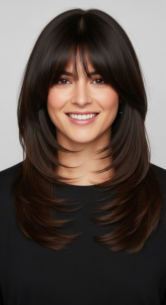 A strong, blunt cut at the bottom meets wispy, layered ends and topped with playful micro-bangs. This look is artistic, a bit French-girl cool, and incredibly striking.