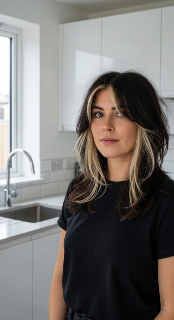 This is a low-maintenance way to play with color because you’re only lightening the front sections. It brightens your face and gives that perfect editorial contrast.