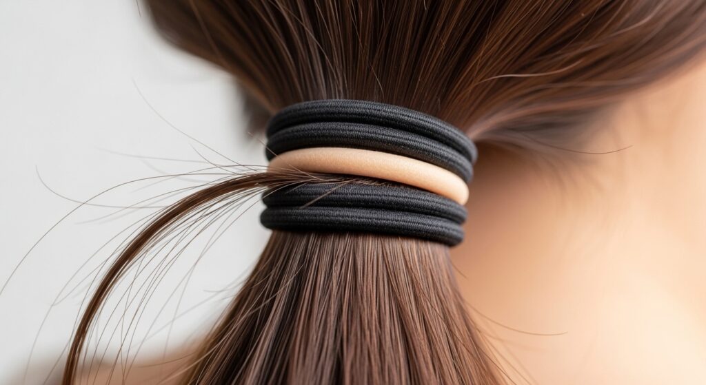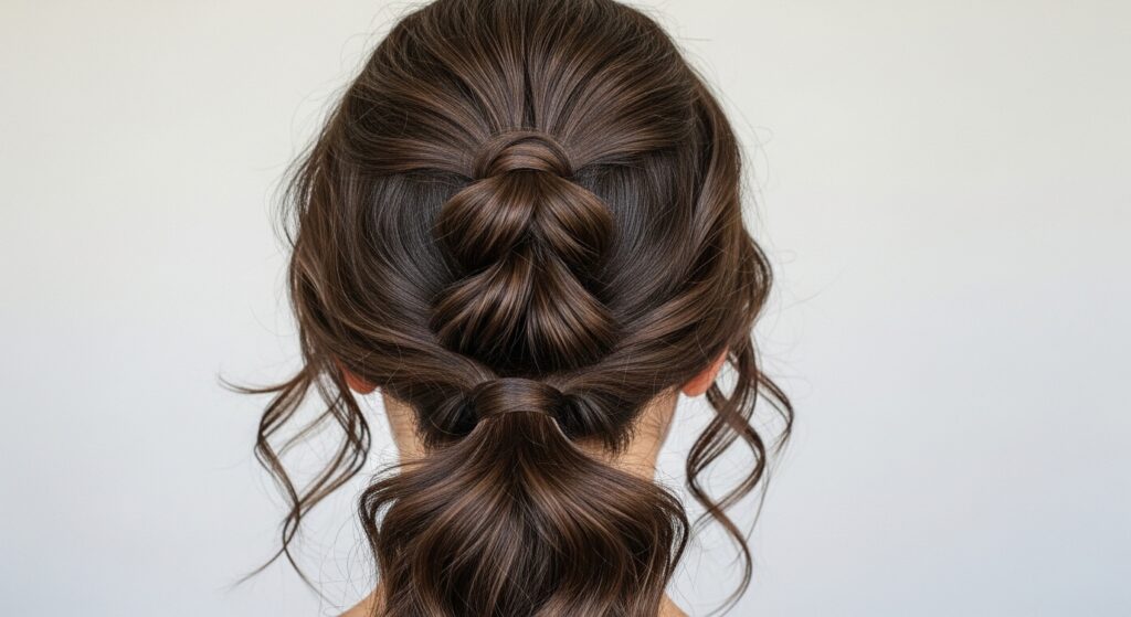 Focus on the area between the two elastics for a chic detail. After securing both ponytails, take a small section of hair from the lower tail and wrap it around the space between the two elastics, pinning it discreetly underneath. This bridges the gap between the tiers and creates a beautiful, polished wrap that looks intricate but is surprisingly simple to achieve.