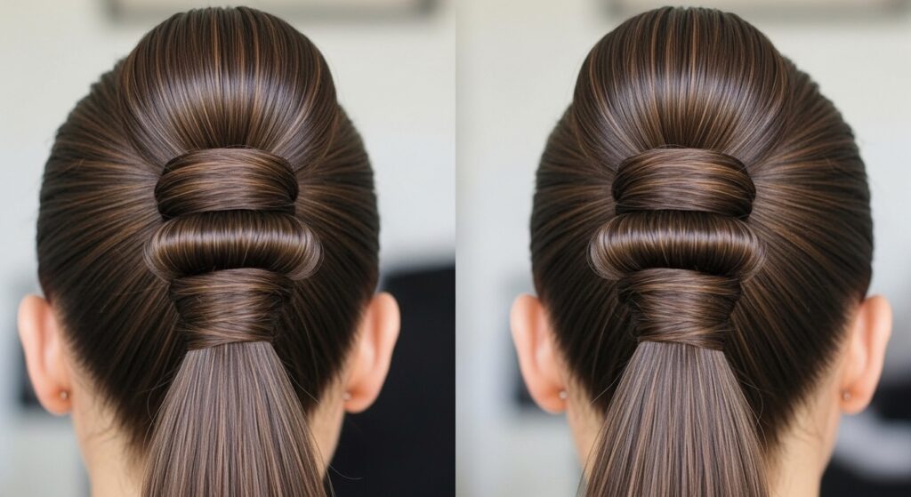 This is the foundational look that started it all. Begin by sectioning the top half of your hair and securing it into a high, tight ponytail. Then, gather the remaining hair with the tail of the first ponytail and secure it directly beneath, creating a seamless, elevated look. The result is immediate lift at the crown and a cascading effect that adds inches. For a sleeker finish, wrap a small strand of hair around each elastic to conceal them.
