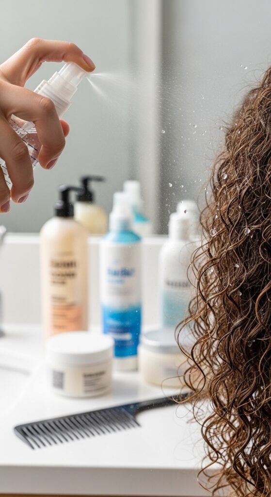 Mix it in a spray bottle: 80% water, 15% leave-in conditioner, and 5% lightweight oil (like argan). Shake well, spray generously, then scrunch. Let it air dry or diffuse lightly.