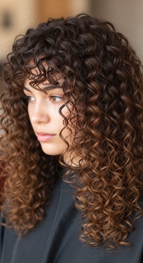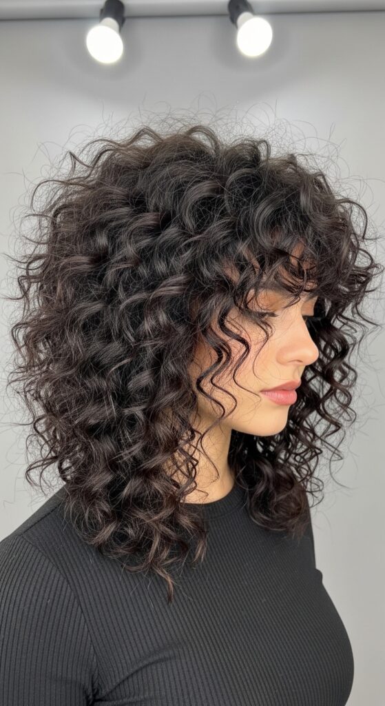 Imagine defined, blunt-cut curly tendrils at the front, framing your face, with the rest of your curls flowing freely. It’s a bold, artistic take that plays with shape and texture.