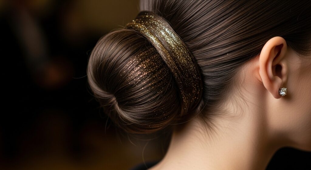 The Glitter-Dusted Chignon: This isn’t your everyday bun. Create a low, sleek chignon at the nape of your neck. Before securing the final pins, lightly spray a section of hair with a temporary hair spray adhesive or use a gel, then gently press on cosmetic-grade glitter in gold or silver. The result is a subtle, mesmerizing sparkle that catches the light with every turn.