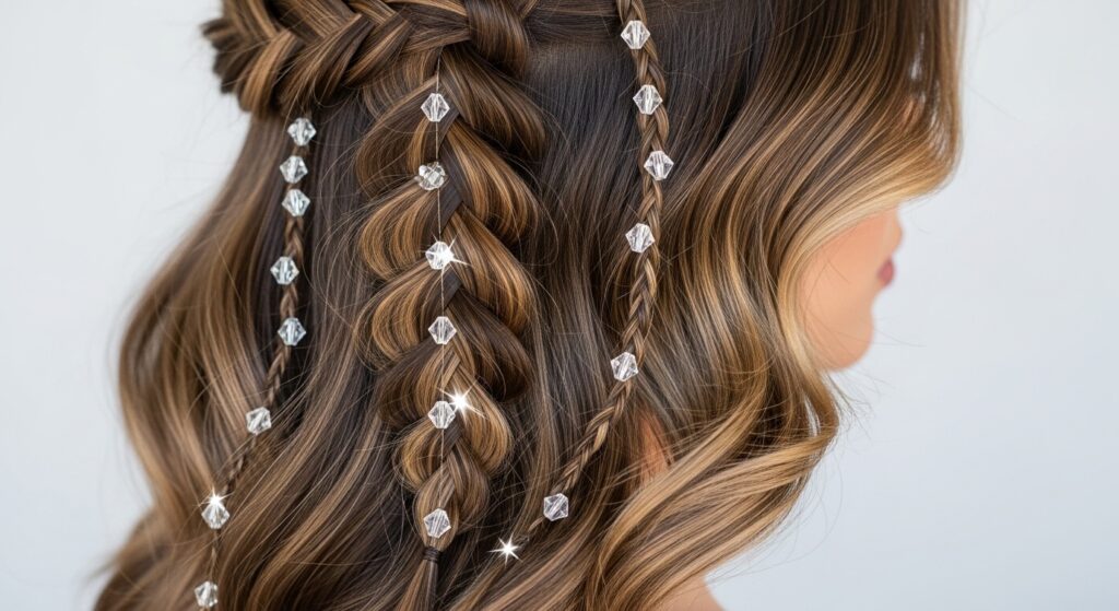 The Waterfall Braid with Crystal Drops: The waterfall braid is ethereal and romantic. Elevate it by incorporating small, clear bead or crystal charms on random strands as you braid. As the braid cascades down the side of your head, these delicate drops will shimmer like melting ice or morning dew.