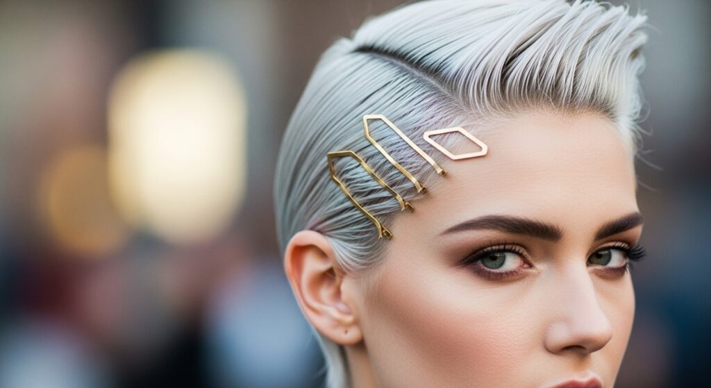 The Slicked-Back Pixie with Metallic Accents: Use a strong-hold gel or pomade to slick back your pixie cut for a sleek, wet-look finish. The holiday twist? Place a few strategically placed, metallic silver or gold hair clips along your hairline or at the side of your head. It’s edgy, modern, and utterly chic.