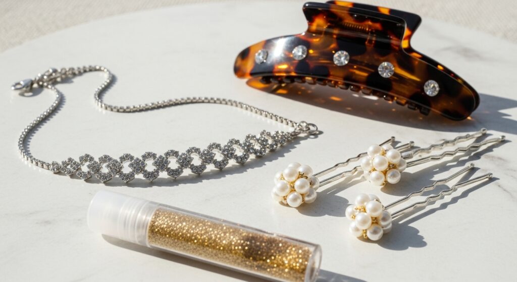 Hair Chains & Cages: These delicate pieces drape across your hair like wearable art. Drape a hair chain from a side part to the opposite ear, or use a “cage” piece over a simple low bun. They look intricate but often simply clip or pin into place.