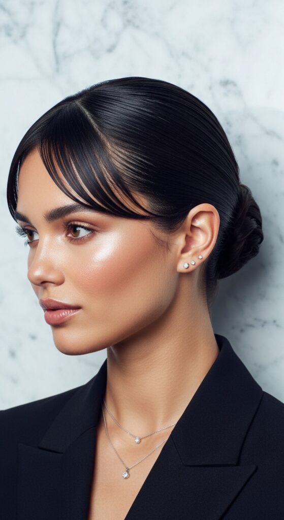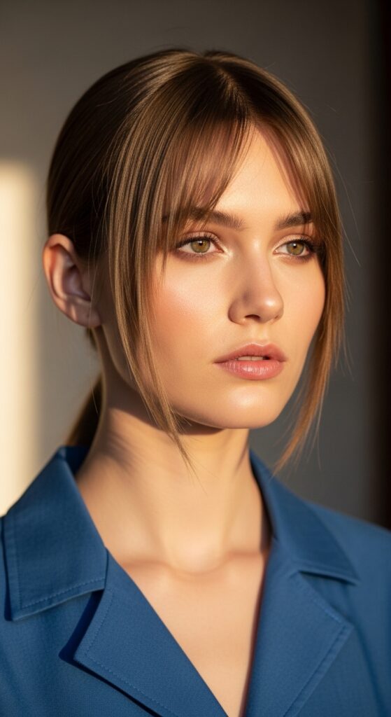 Combine your wispy bangs with a slicked-back “wet look” ponytail or bun. The contrast between the structured, polished back and the soft, face-framing wisps is pure quiet luxury.