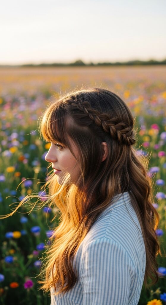 Add a boho touch. Pull back the rest of your hair with a small, delicate braid along your hairline, leading into your wispy bangs. It’s romantic, detailed, and perfect for a special day.