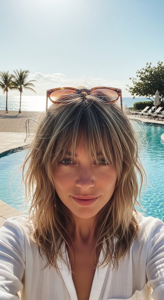Casual, sun-kissed, and impossibly cool. This is the ultimate low-effort, high-impact style. The piecey, separated texture of the bangs mirrors the effortless vibe of beach waves.