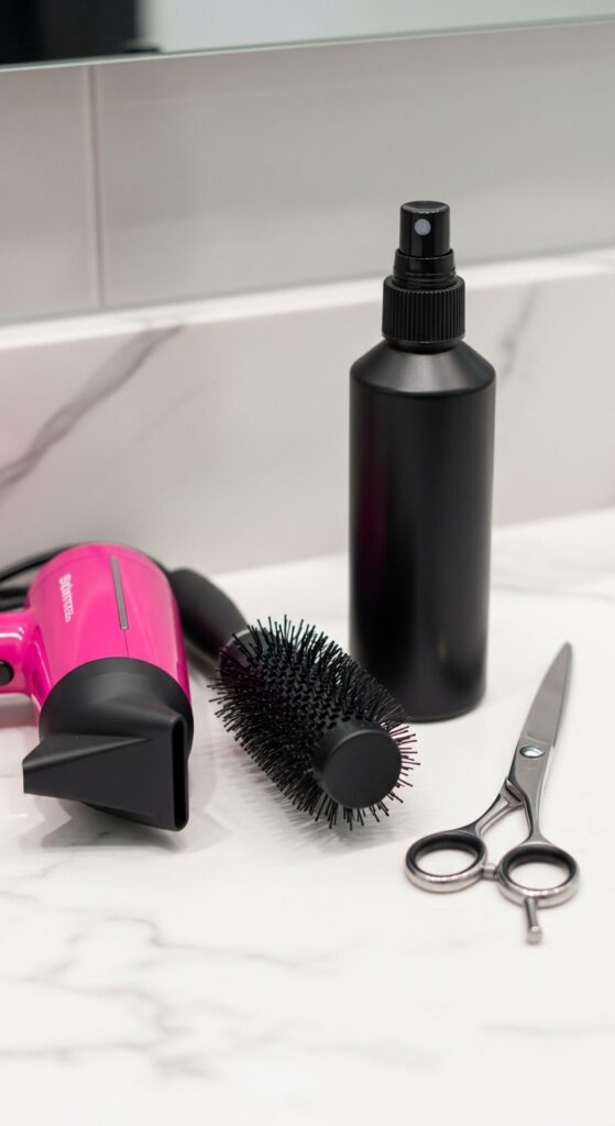 Keeping wispy bangs looking their best is simple. You’ll need a small round brush for blow-drying and a light-hold hairspray or texturizing spray. Avoid heavy products that weigh down the fine ends.