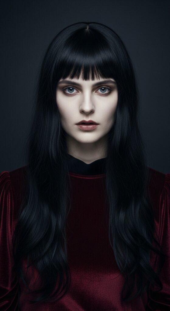 The iconic vampire haircut—long with heavy, straight-across bangs—gets a wearable update. Swap the solid block for a wispy, textured version. It keeps the mysterious, romantic goth hairstyles vibe but feels lighter.