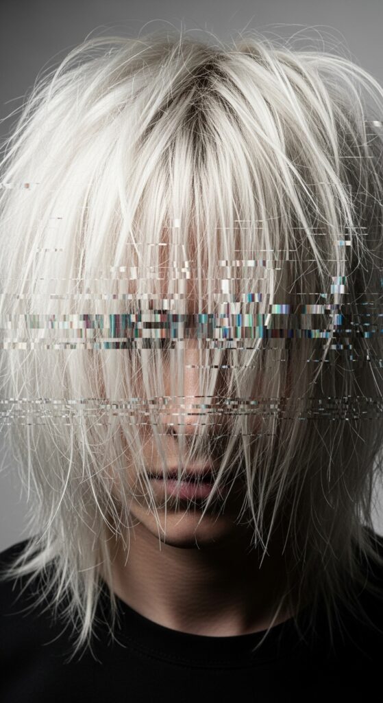 This is where wispy bangs meet intentional, artful texture. Think uneven lengths, see-through patches, and a piecey, almost digital-looking finish. It’s the heart of the glitchy glam hair trend.