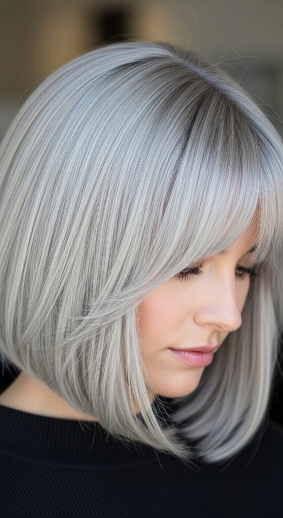 Gray or silver hair with wispy bangs is a stunning, fashion-forward combination. The wispy texture adds movement and prevents any solid block of color from looking flat.
