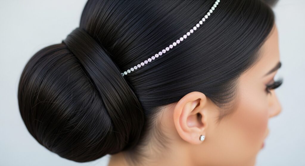 20. Crystal-Encrusted Part: A sleek updo (like a low bun or chignon) is placed off-center, with a line of tiny crystals or pearls following the dramatic side part.