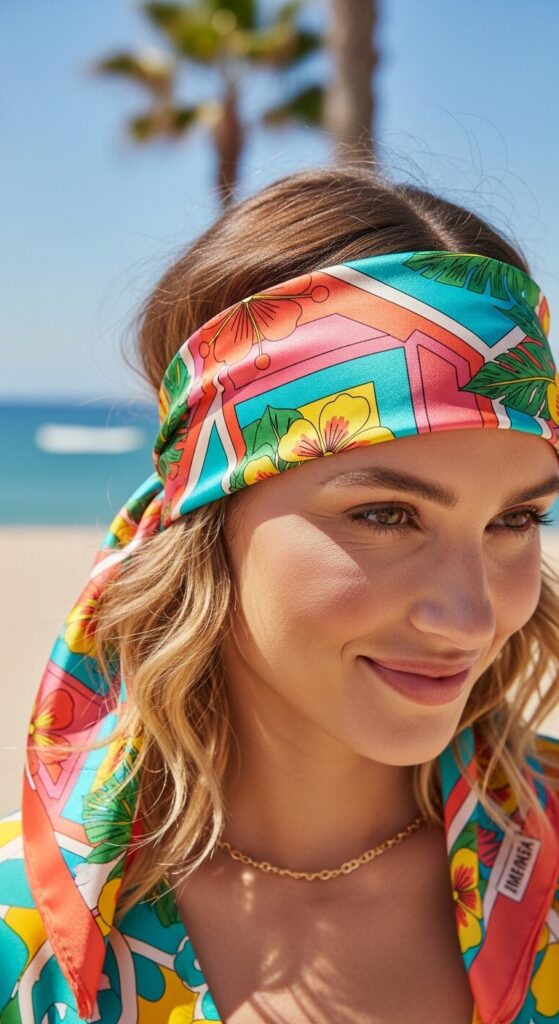 Style your waves as usual. Fold a long, thin scarf into a band. Tie it around your head, just behind your hairline, and knot it at the nape of your neck. Tuck the ends under the band for a clean finish.
