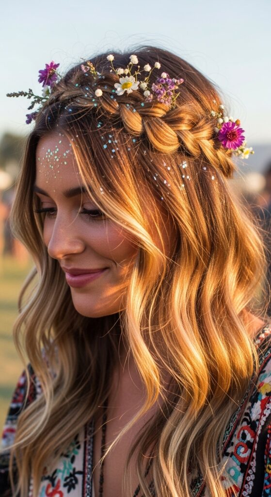Create a deep side part. On the heavier side, start a loose Dutch braid (braiding under) along your hairline, continuing it to the other side. Pin it. Style the rest of your down hair into loose waves.