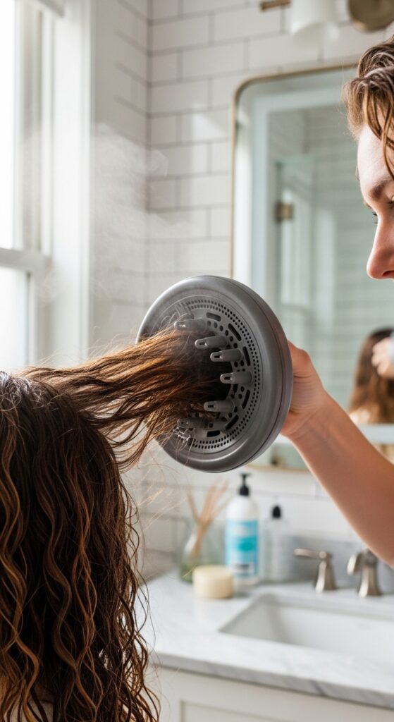 Don’t just scrunch wildly. Place sections of hair into the diffuser cup, hold it against your scalp, and let it dry on a low heat and speed setting. This builds volume and definition without the frizz.