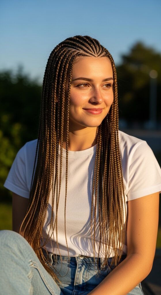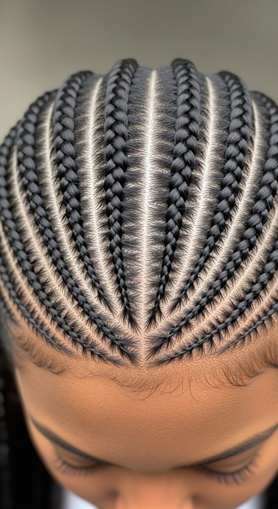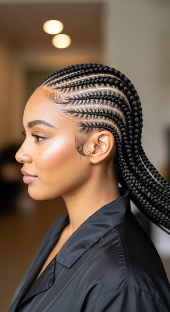 Length adds drama. Long cornrows are stunning when they’re uniform and swing as you walk. Keep them thin for a more delicate look.