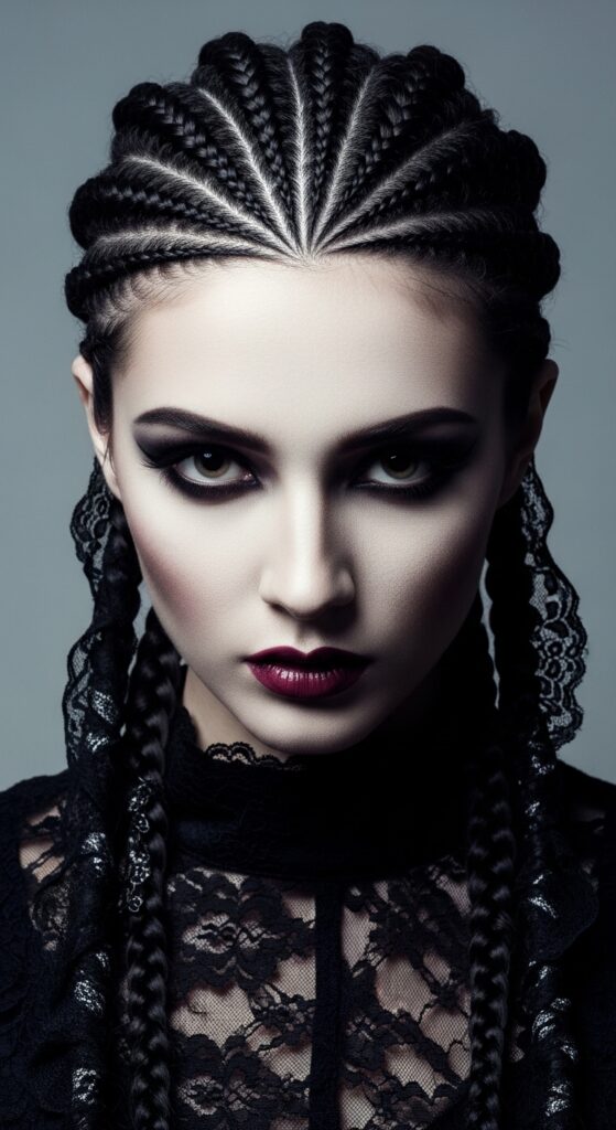 If you love romantic goth hairstyles, this is your match. Weave a thin lace ribbon into your cornrows for a dark, vintage feel.