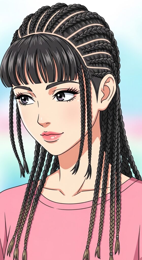 The hime cut usually involves blunt bangs and long hair, but with cornrows, it translates to short front braids and longer back ones. Very unique.