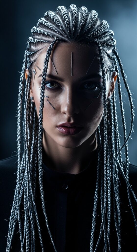 Glitchy glam hair is about metallic accents and futuristic shine. Add silver or gold thread to a few rows for a techy, cool vibe.