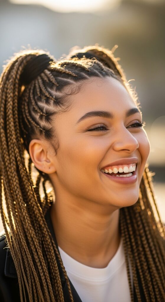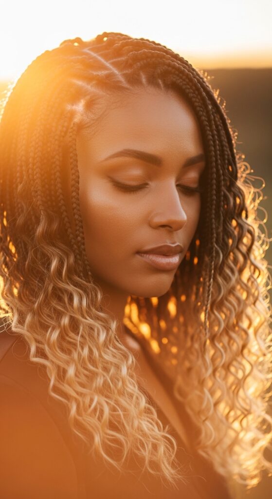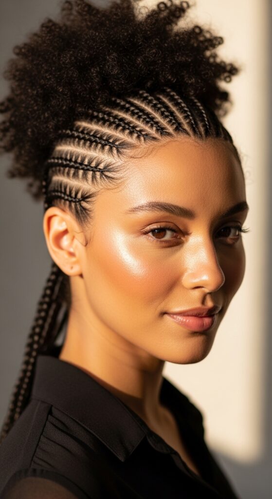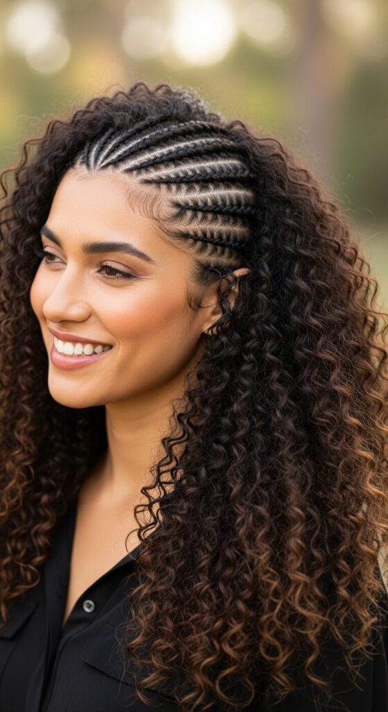 This style blends the structure of cornrows with the softness of loose curls. It’s romantic and effortless—ideal for date night or a weekend brunch.