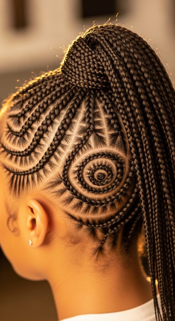 A ponytail is always chic, but when your cornrows lead into it, it’s next level. Add a little swirl at the base for a touch of personality.