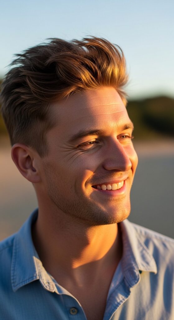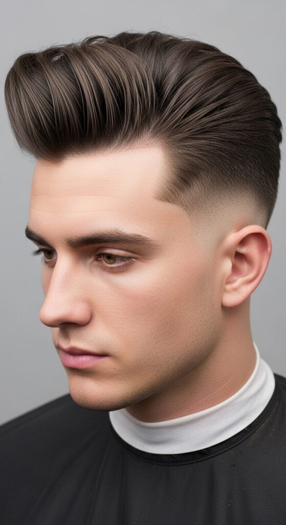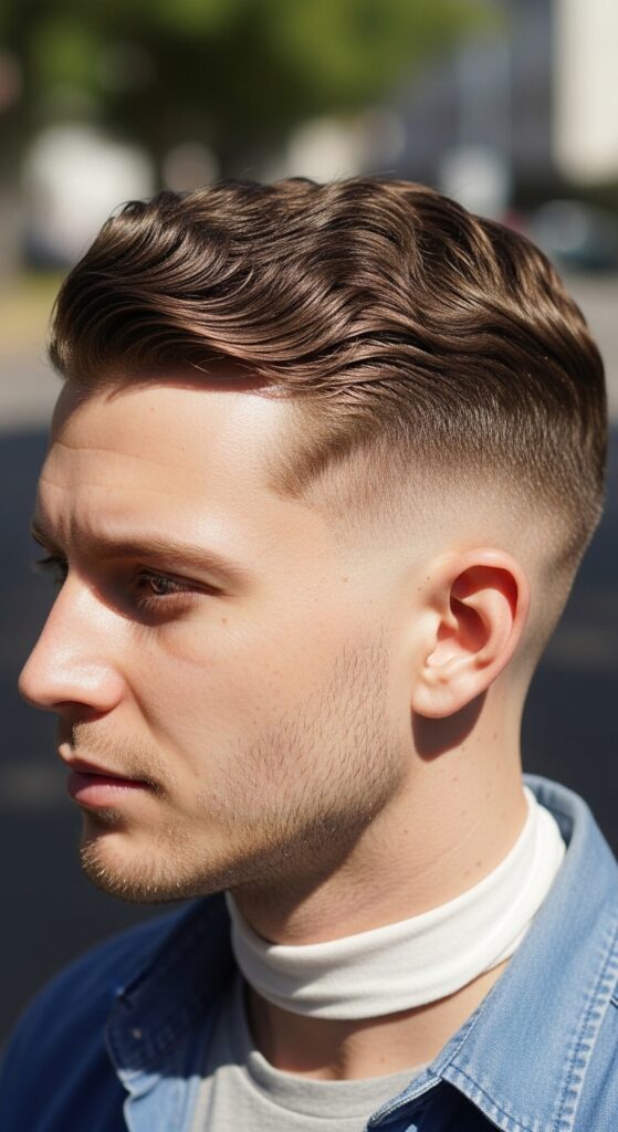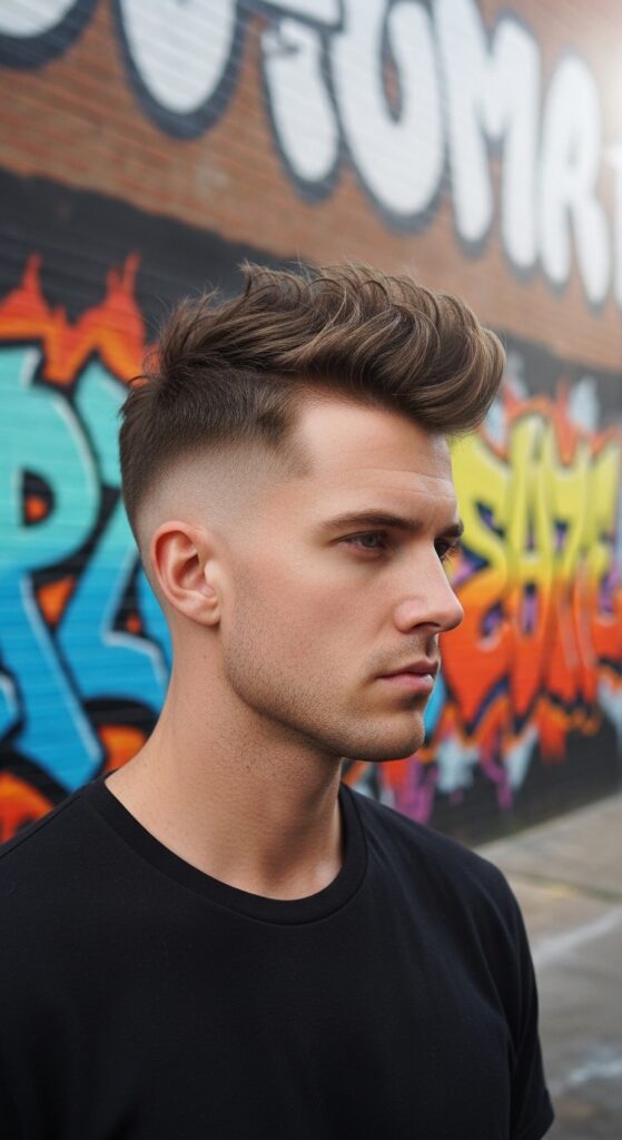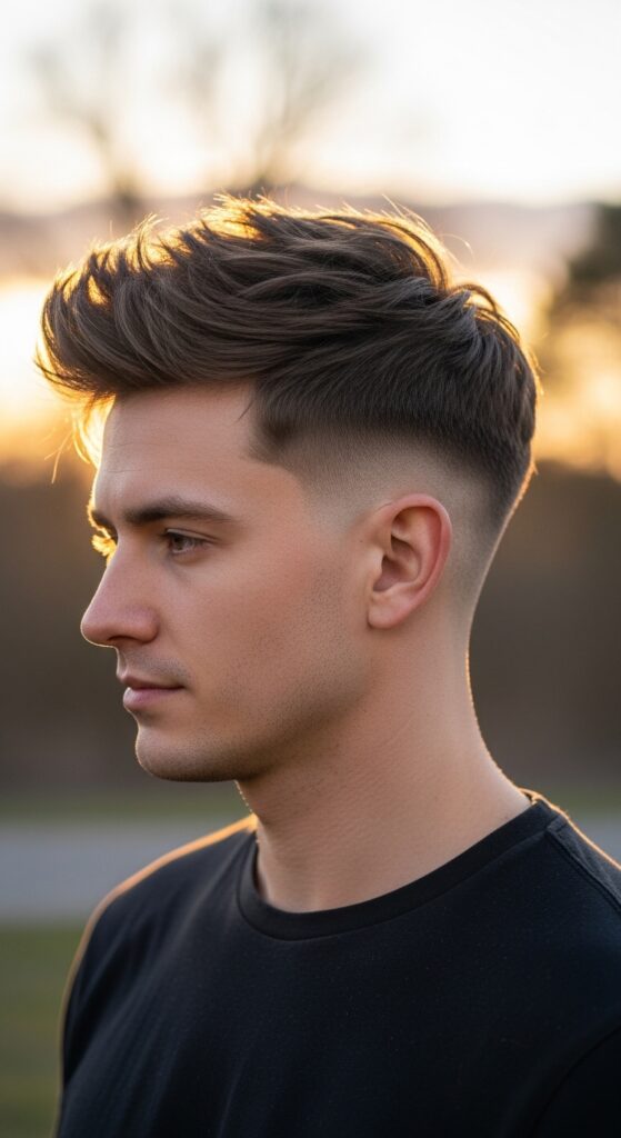 Keep the top long—about 4 to 5 inches—and fade the sides. You can style it pushed back, to the side, or messy. It’s the most versatile fade on the list.