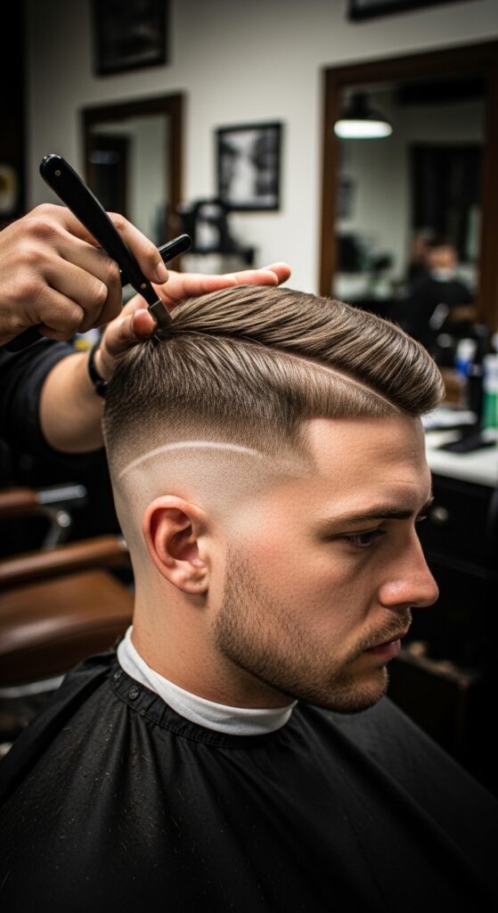 This is a favorite for guys who want a sharp, defined look. It works with almost any fade type and gives you that “old money” energy. It’s crisp, clean, and never looks sloppy.