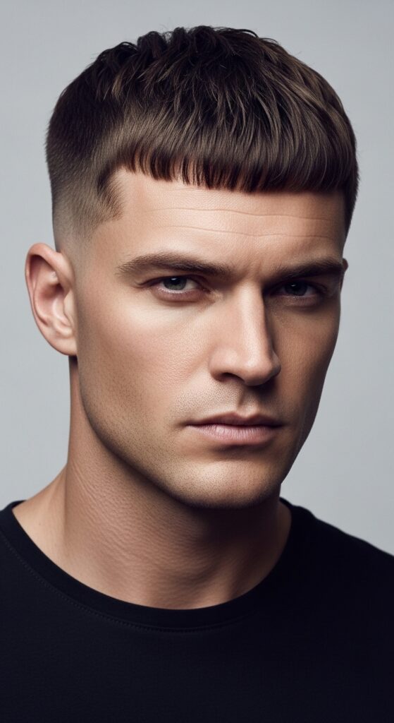 The Caesar is a short, straight-across fringe with a fade below. It’s no-fuss, very clean, and historically stylish. Think Julius Caesar with a modern upgrade.