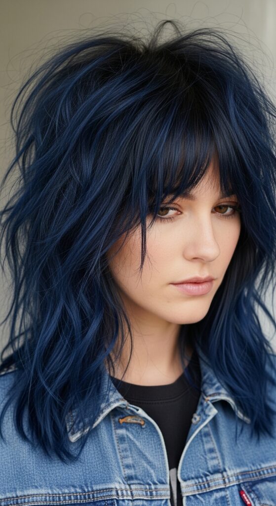 The vampire haircut—all shags and mullets and texture—gets a new life with blue black. The many layers catch the light differently, creating a shimmering, multi-dimensional effect.