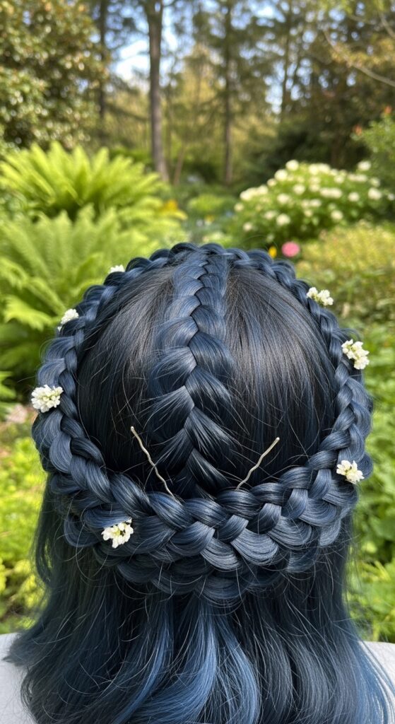 Incorporate the color into an elegant updo. A braided crown or halo braid in blue black looks regal and intricate. The color adds depth to the braid, making every twist and turn visible.