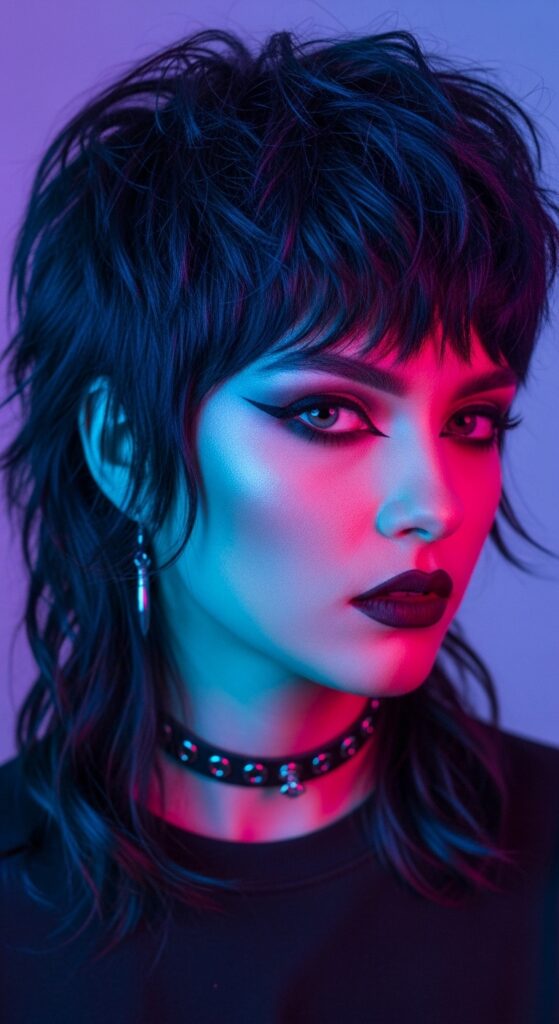 Channel romantic goth hairstyles with this look. Think long, flowing blue black hair with soft, undone barrel waves. It’s darkly romantic, poetic, and incredibly beautiful.
