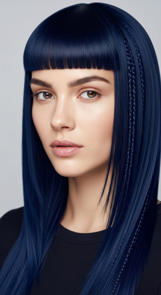 The hime cut is having a major moment. This traditional Japanese style features straight, blunt-cut hair with dramatic, disconnected front pieces. In blue black, it’s absolutely breathtaking.