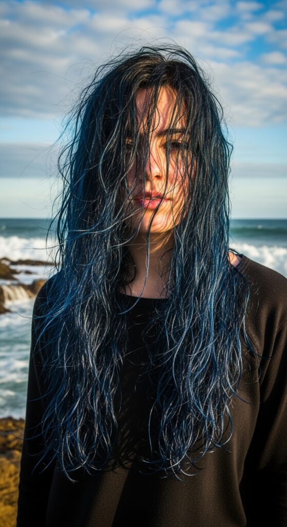 Long, layered hair in blue black looks like a mermaid’s mane. The layers create movement, and as you walk, the different lengths catch the light in a wave of blue and black.