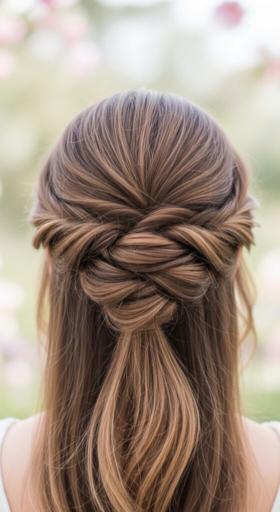 Take a deep section from your temples back. Twist each side loosely, then cross them and pin them at the back of your head. Don’t pin them flat—create a little lift for a crown effect.