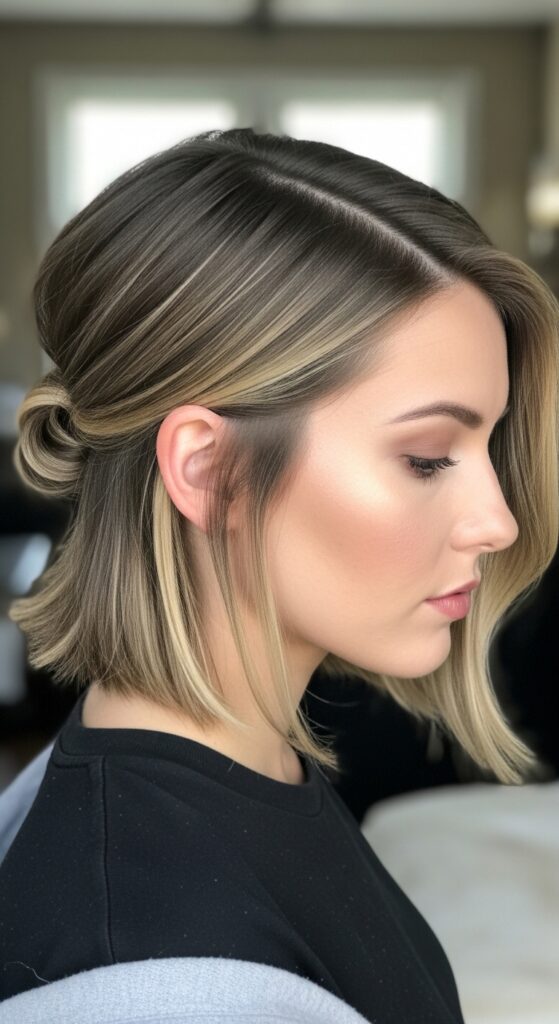 On the longer side of your lob, take a section from the front. Twist it back and secure it in a tiny, flat knot just above or behind your ear. Pin it neatly. Leave the rest of your hair down and textured.