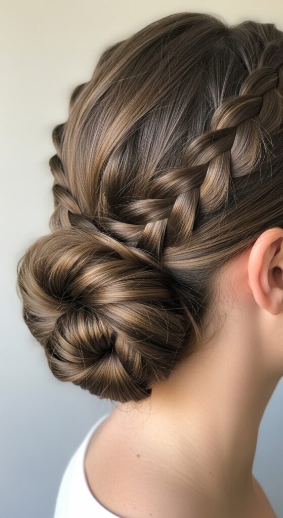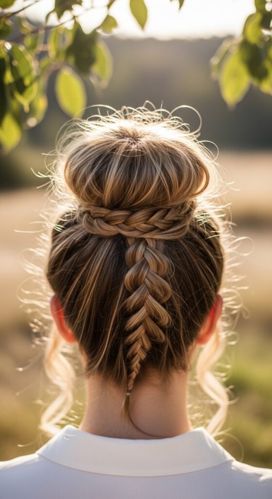 Create a loose side braid (a simple three-strand is fine) on one side of your head. Gather all your hair, including the braid, into a low or mid-height bun. Wrap the tail of the braid around the bun’s base and pin it.