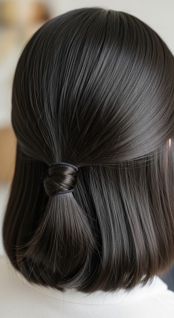 Isolate the two long front sections of your hime cut. Bring them to the back of your head, just below the crown. Tie them together in a simple knot or small braid, and pin them flat. Let your blunt bob and bangs remain untouched.