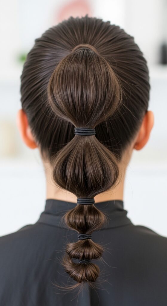 Create a high ponytail. Place elastics every few inches down the length. Gently pull on each section between elastics to create full “bubbles.” On the last section, twist the hair into a small, messy knot and pin it.
