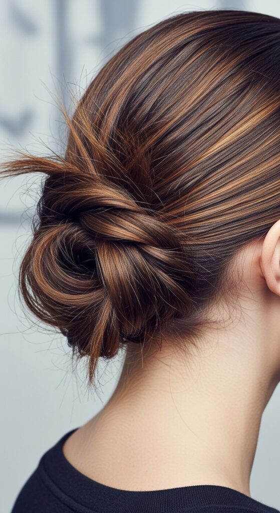 Brush your hair smoothly into a low ponytail. Instead of tying it, twist the length and roll it upwards, tucking it under to create a soft roll. Pin it securely. The base of the roll will have a knotted appearance.