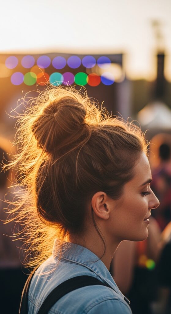 Space buns get a boho upgrade. Instead of tight buns, we’re creating two textured, knotted orbs. This is playful, youthful, and holds up amazingly in crowd chaos.