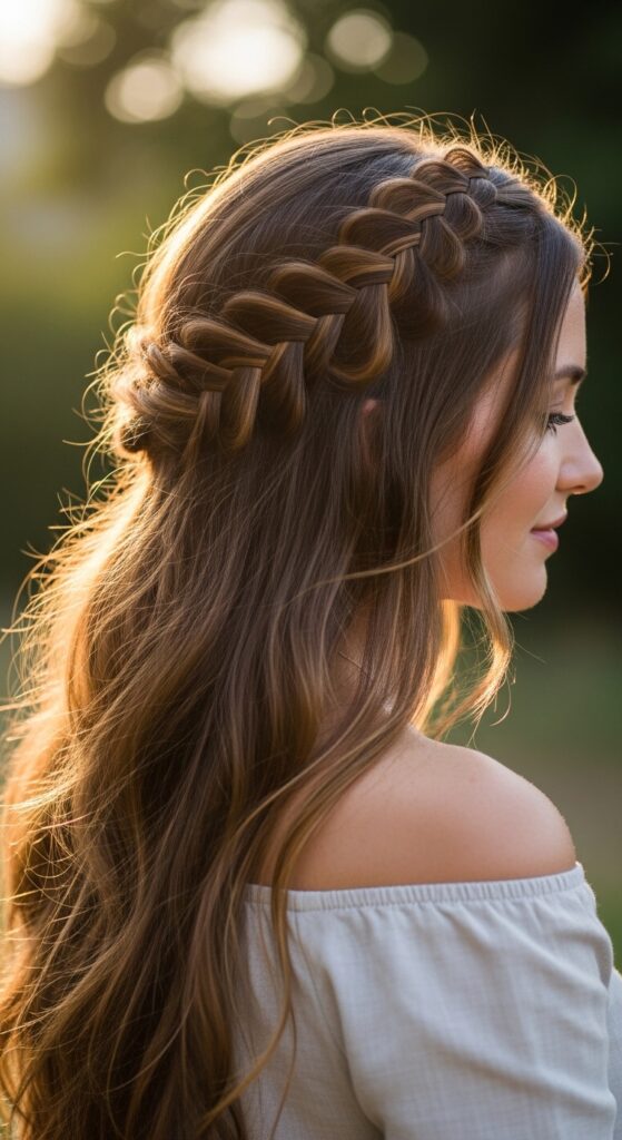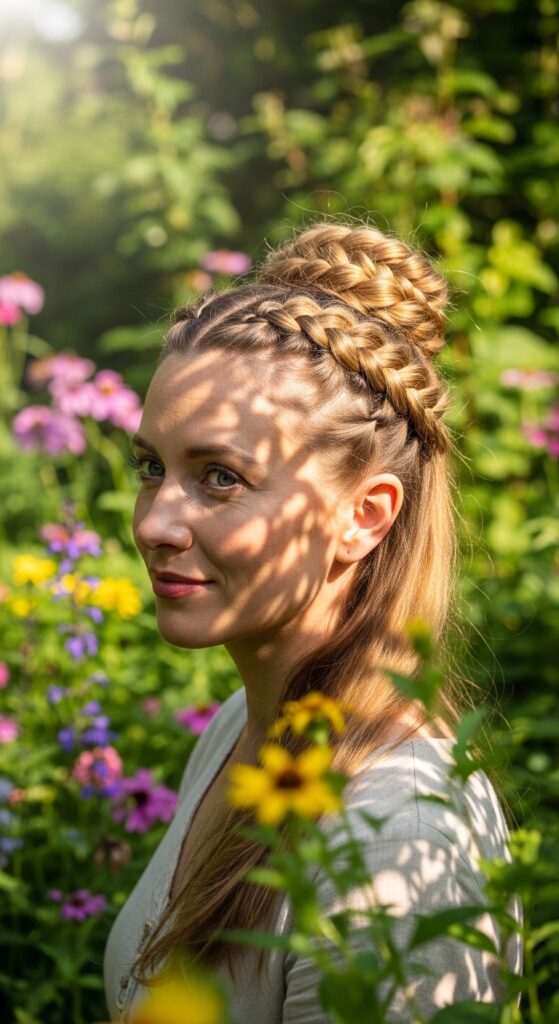 Braid two Dutch braids from the front and meet them at the back. The rest of the hair stays down. It’s intricate-looking but easy with practice.