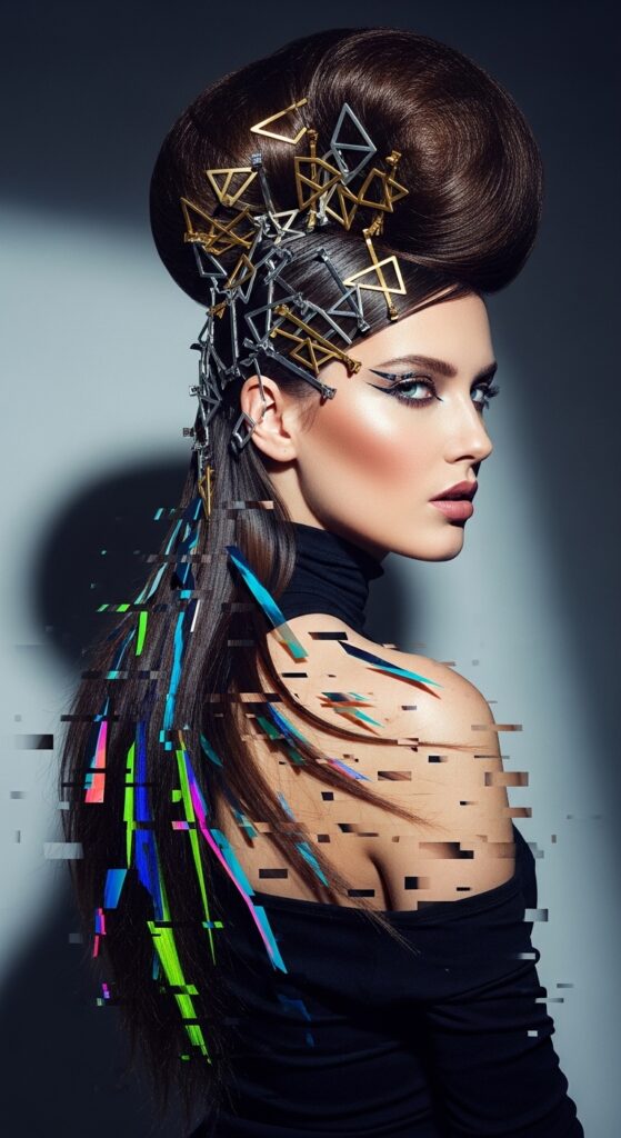 For the bold ones: glitchy glam hair is about texture and shine. Think a smooth, high bump on top with the rest left straight and shiny. Add a metallic hair clip for that futuristic touch.