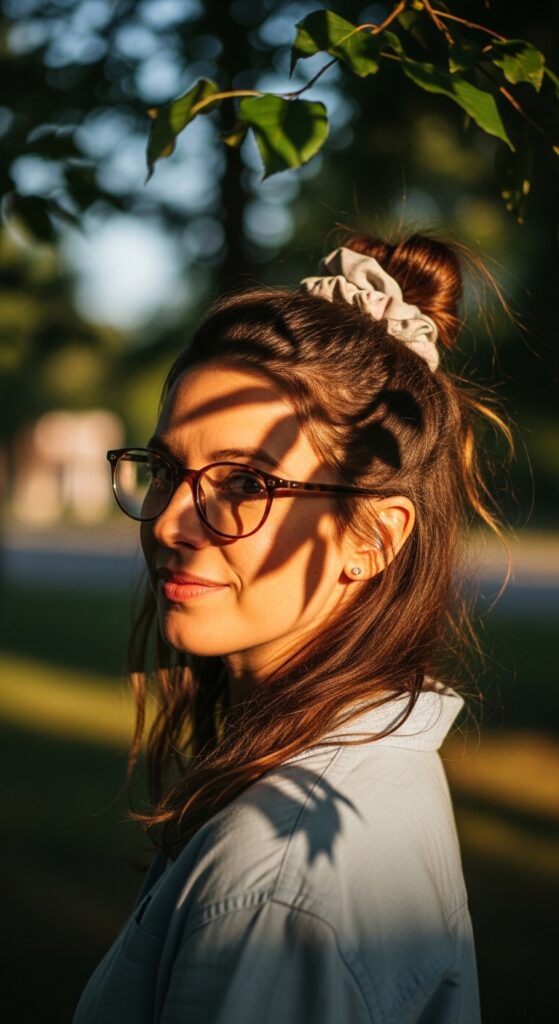 No pins, no clips. Just pull the top half into a scrunchie. It’s the most casual look on this list, but it works for grocery runs or coffee dates.