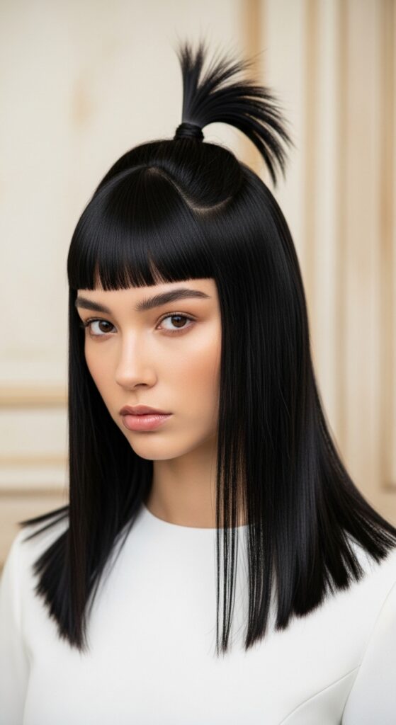 The hime cut has distinct blunt front pieces. For a half up style, simply pull the top section into a mini ponytail and leave those front pieces down. It’s anime-inspired and super chic.