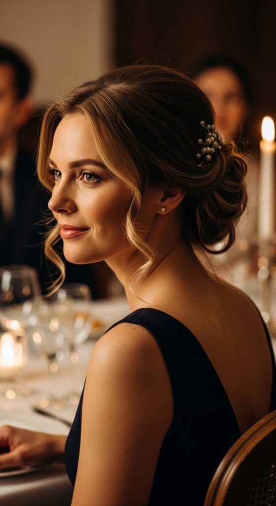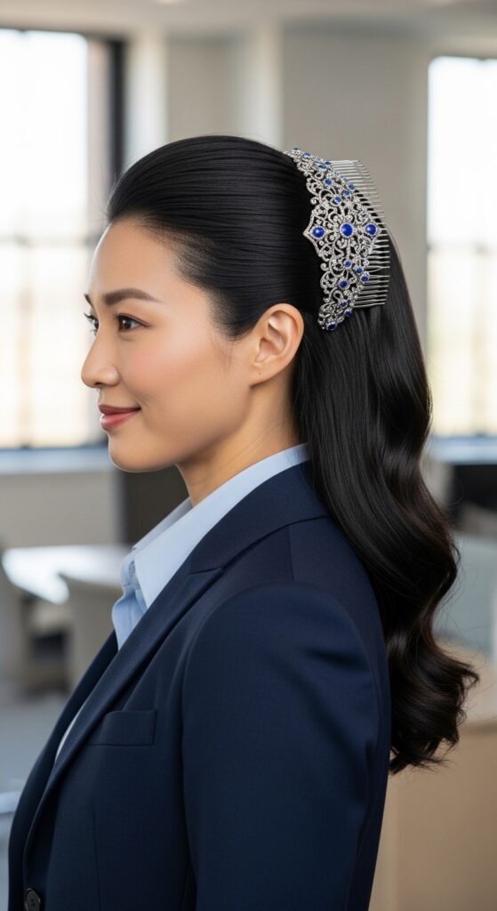 For formal days, this is king. Comb the top section smooth, and insert a decorative comb. The rest stays straight or curled.
