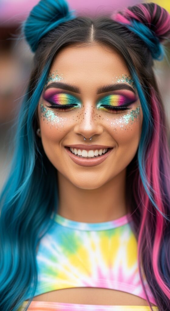 Two tiny buns on top of your head. The rest of your hair is down. This is glitchy glam hair fun.