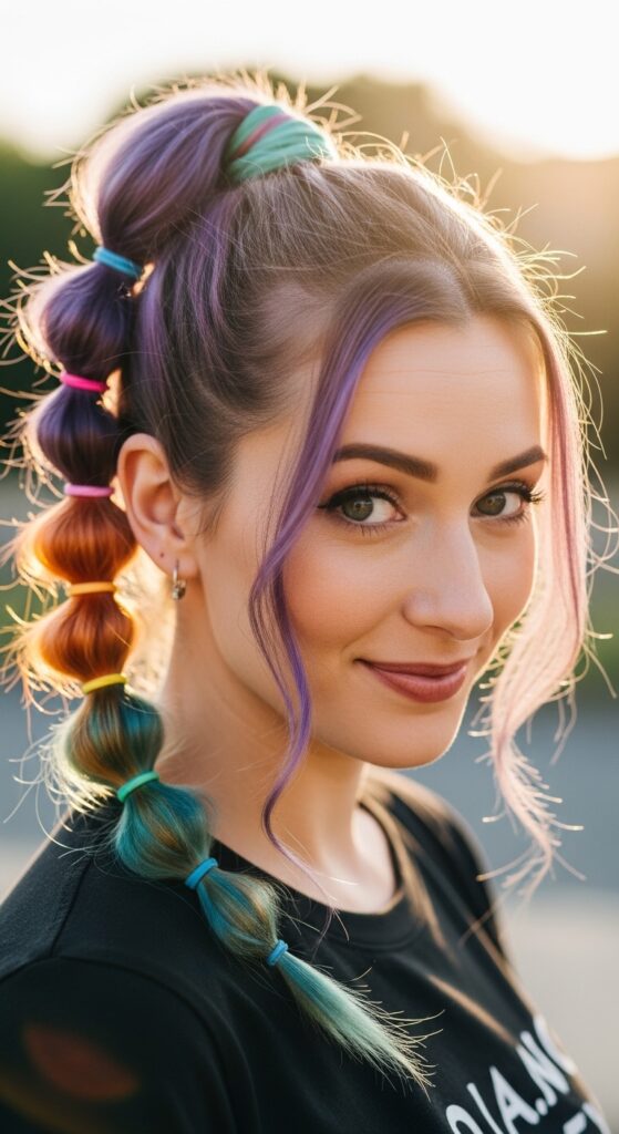 This is so fun. Put the top half in a ponytail, then wrap tiny elastics down the length to make “bubbles.”