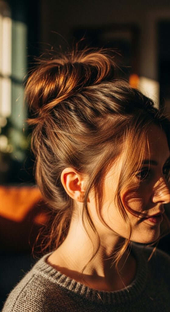 This is my lazy Sunday look. Gather the top half, twist it into a low bun, and pull a few face pieces out. It’s intentionally messy and looks like you spent ten minutes (but you didn’t).